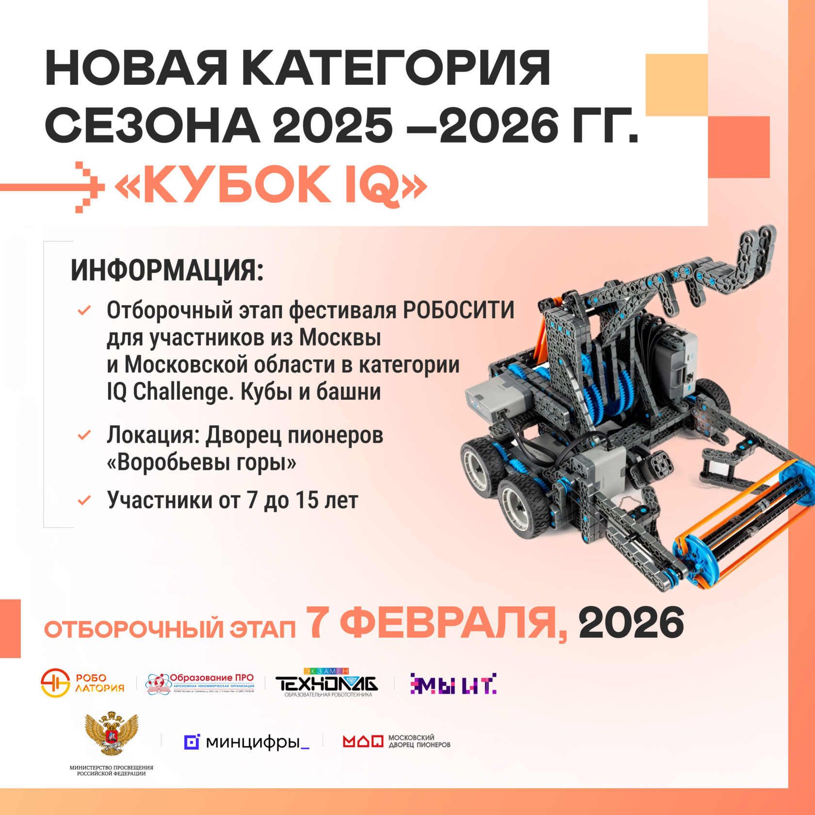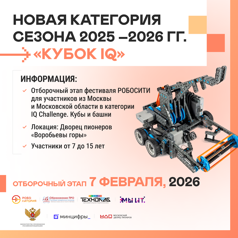 7 февраля 2026 года в Московском дворце пионеров на Воробьёвых горах стартует отборочный этап Всероссийского фестиваля робототехники «РОБОСИТИ 2026» для команд из Москвы и Московской области в категории "Кубок IQ".